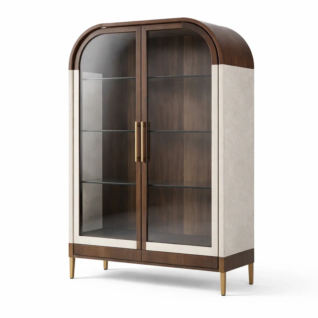Vetrina curvata in legno e vetro temperato con ripiani in metallo