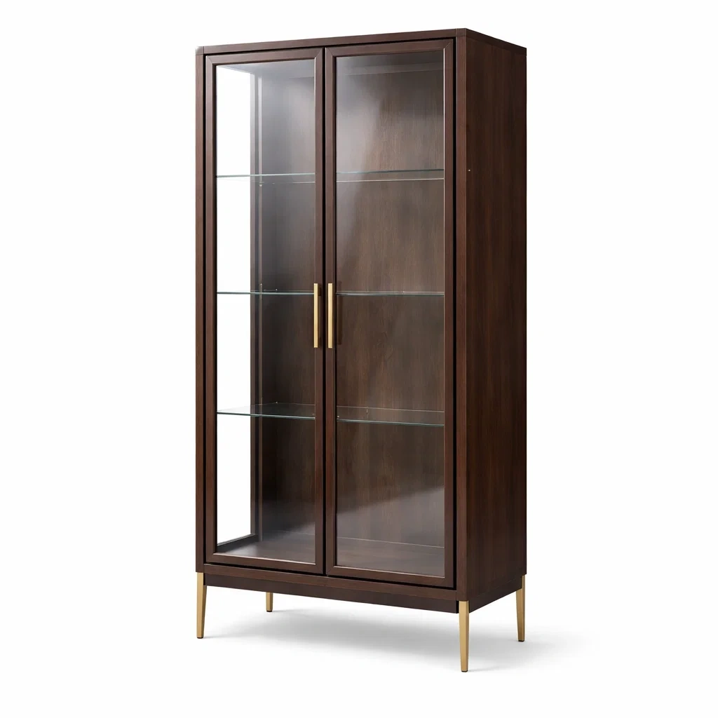 Vetrina in legno scuro con porte in vetro temperato e maniglie dorate