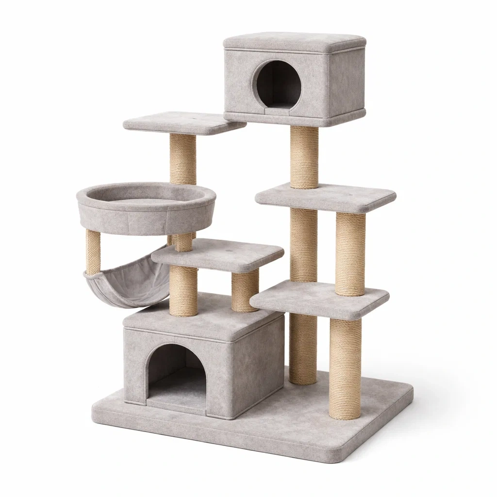 Struttura con piattaforme multiple e aree di riposo, include piattaforme, amaca, casetta e colonne.