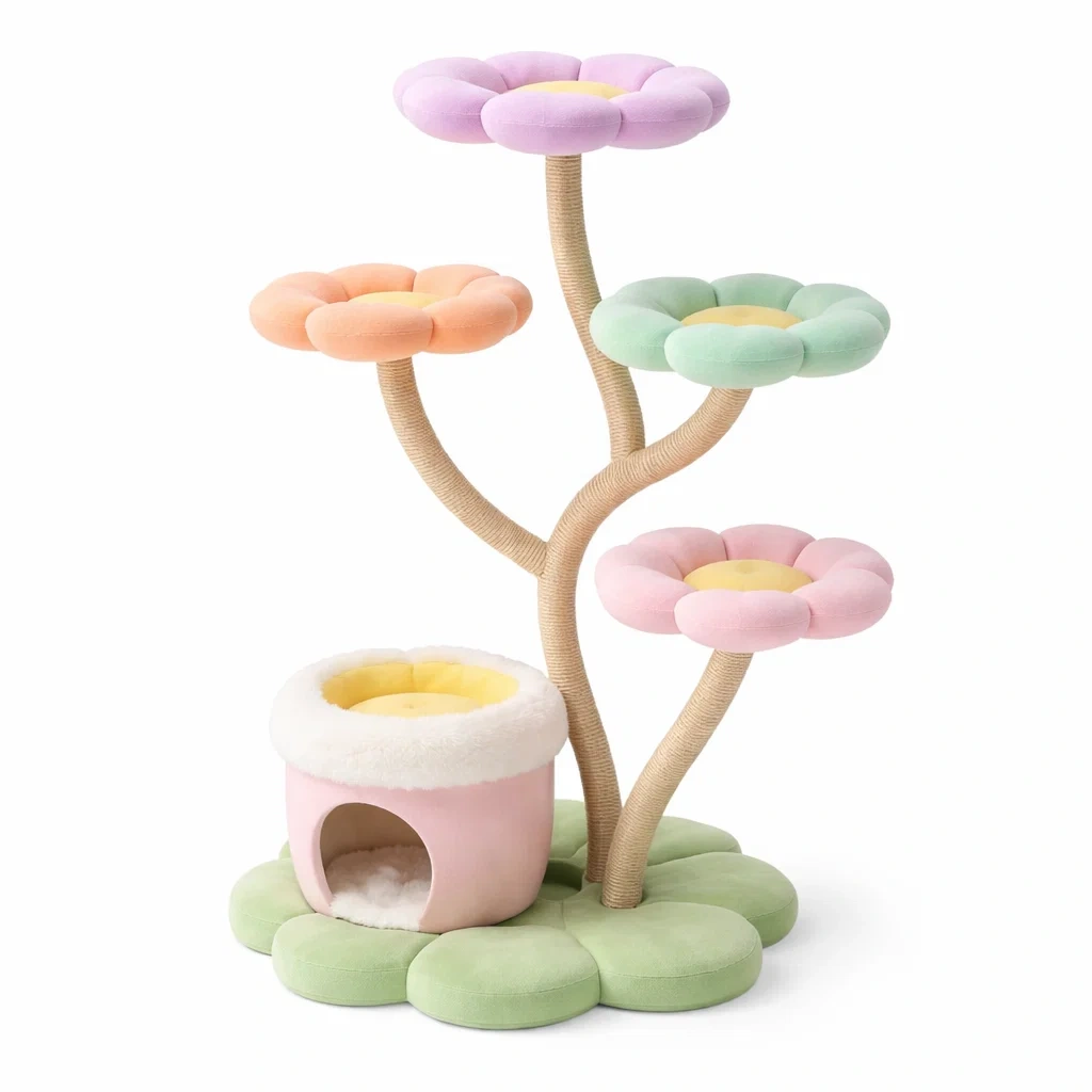 Funzione: Struttura per arrampicata e graffiatoio con piattaforme a forma di fiore e cuccia.
