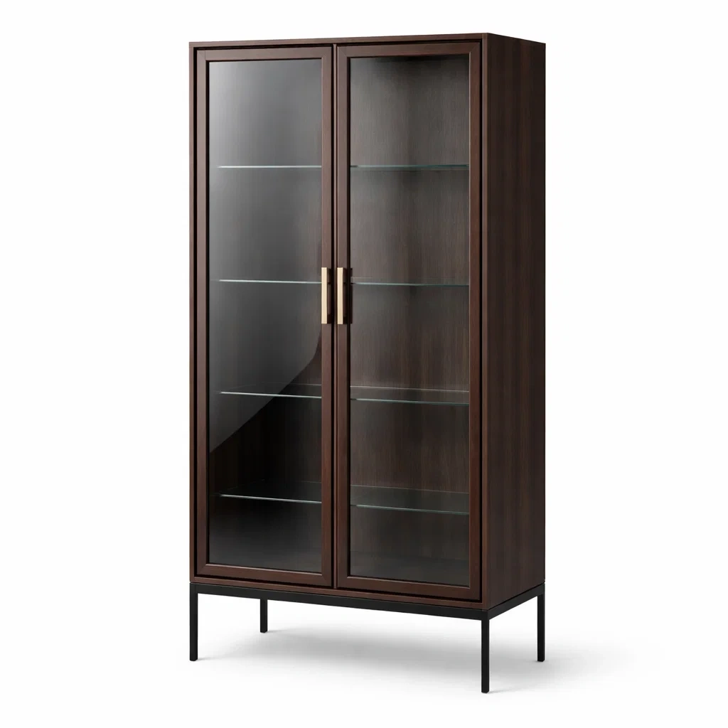 La vetrina presenta una struttura in legno robusto e due ante in vetro temperato di alta qualità. Le mensole interne sono in vetro trasparente da 8 mm, supportate da un telaio in metallo resistente. L'altezza totale è di 180 cm, con una larghezza di 80 cm e una profondità di 40 cm. La vetrina offre cinque ripiani spaziosi per l'esposizione di oggetti. Pulire con un panno umido per mantenere la finitura.